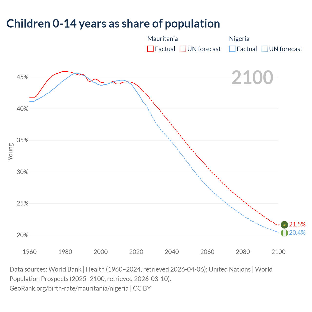 According to the latest available data on birth rates, the fertility rate in Mauritania was 4.7 children per woman in 2023, compared to 4.48 in Nigeria in 2023. The replacement level is considered to be 2.1 children per woman.