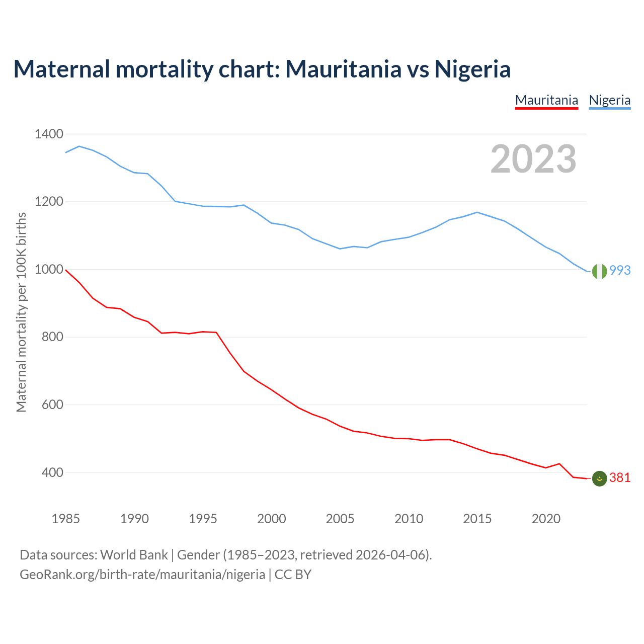 The maternal mortality rate, which is the probability of dying during childbirth or within 42 days of pregnancy termination, is 381 deaths per 100,000 live births in Mauritania, compared to 993 deaths in Nigeria.