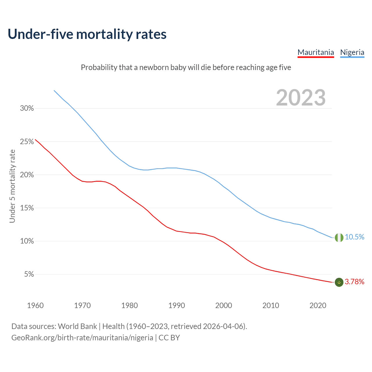 The chance that a newborn baby will die before reaching age five is 3.78% in Mauritania and 10.5% in Nigeria. Above is a chart with historical data on under-five mortality rates.