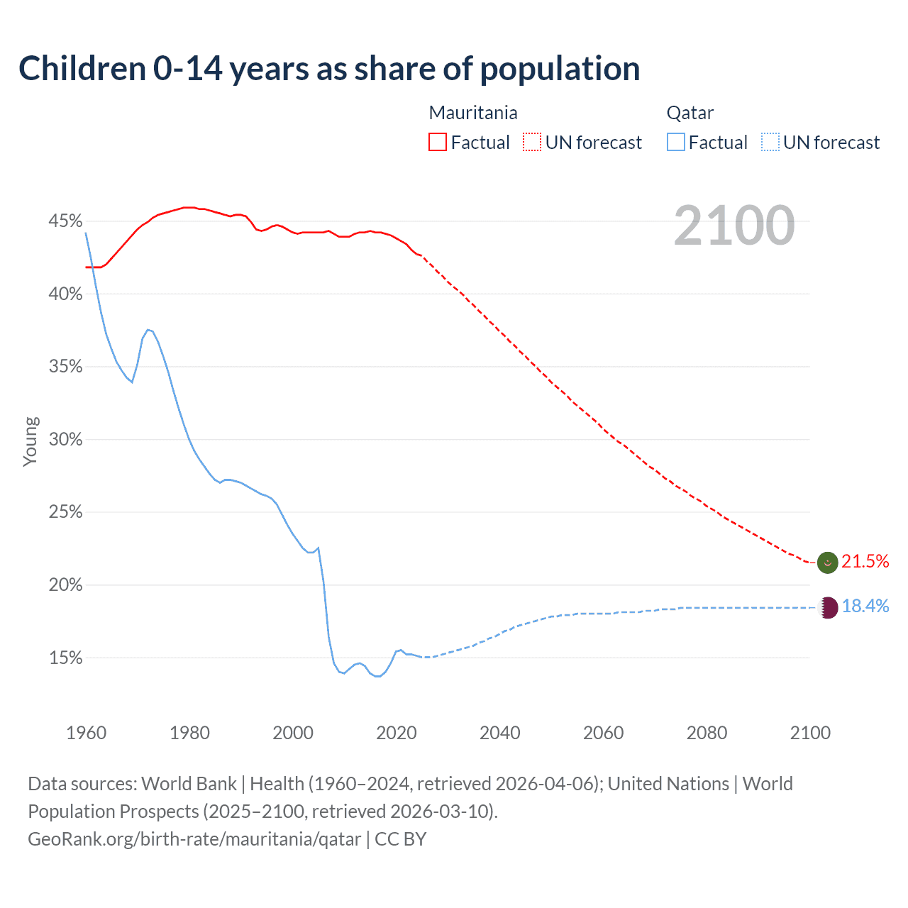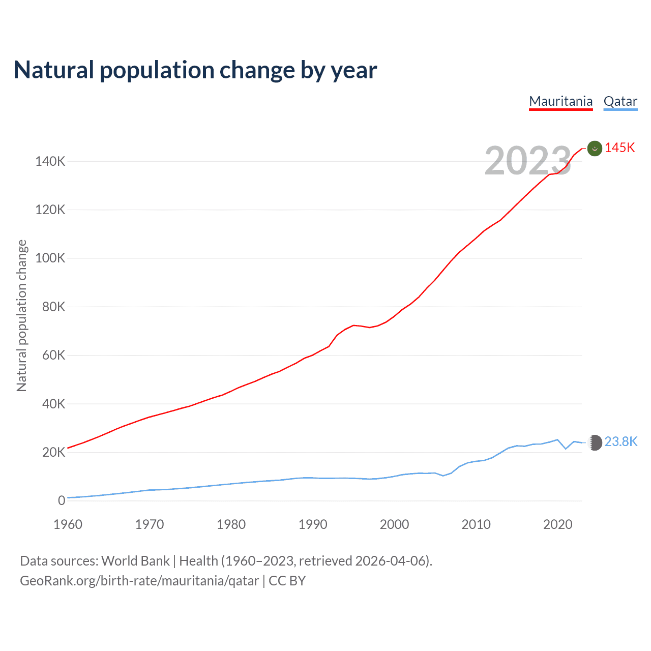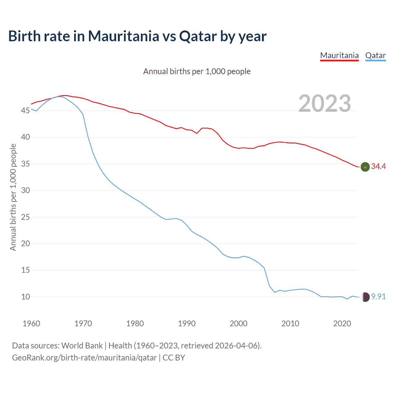 Mauritania has an annual birth rate of 34.4 births per 1,000 people, compared to 9.91 for Qatar. The average number of children a woman is expected to have during her lifetime — the fertility rate, is 4.7 in Mauritania and 1.73 in Qatar — 63.2% difference.