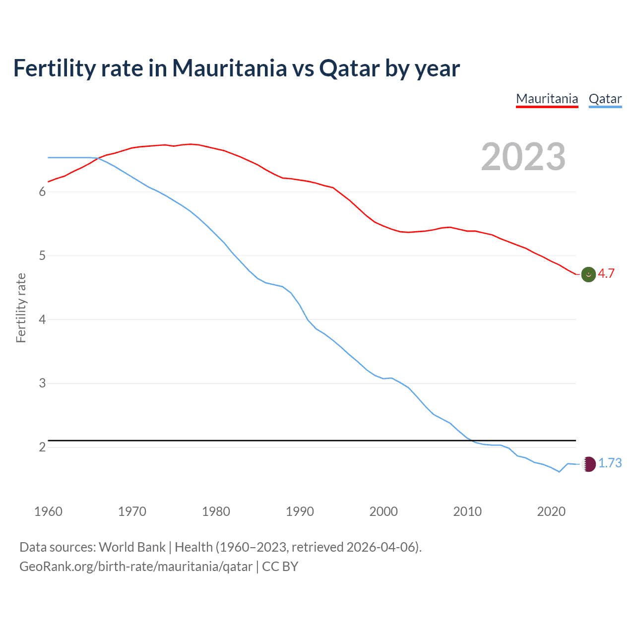 According to the latest available data on birth rates, the fertility rate in Mauritania was 4.7 children per woman in 2023, compared to 1.73 in Qatar in 2023. The replacement level is considered to be 2.1 children per woman.