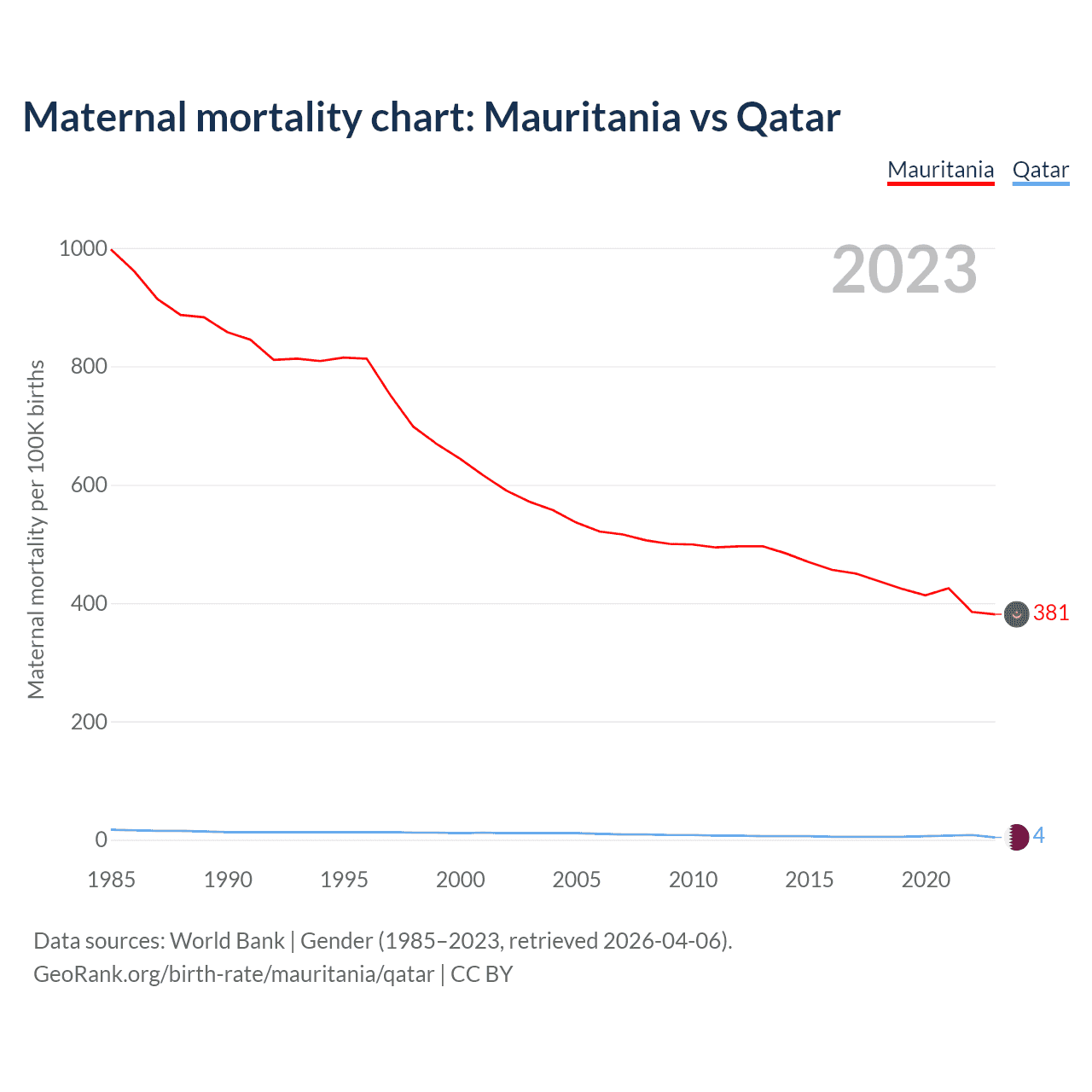 The maternal mortality rate, which is the probability of dying during childbirth or within 42 days of pregnancy termination, is 381 deaths per 100,000 live births in Mauritania, compared to 4 deaths in Qatar.