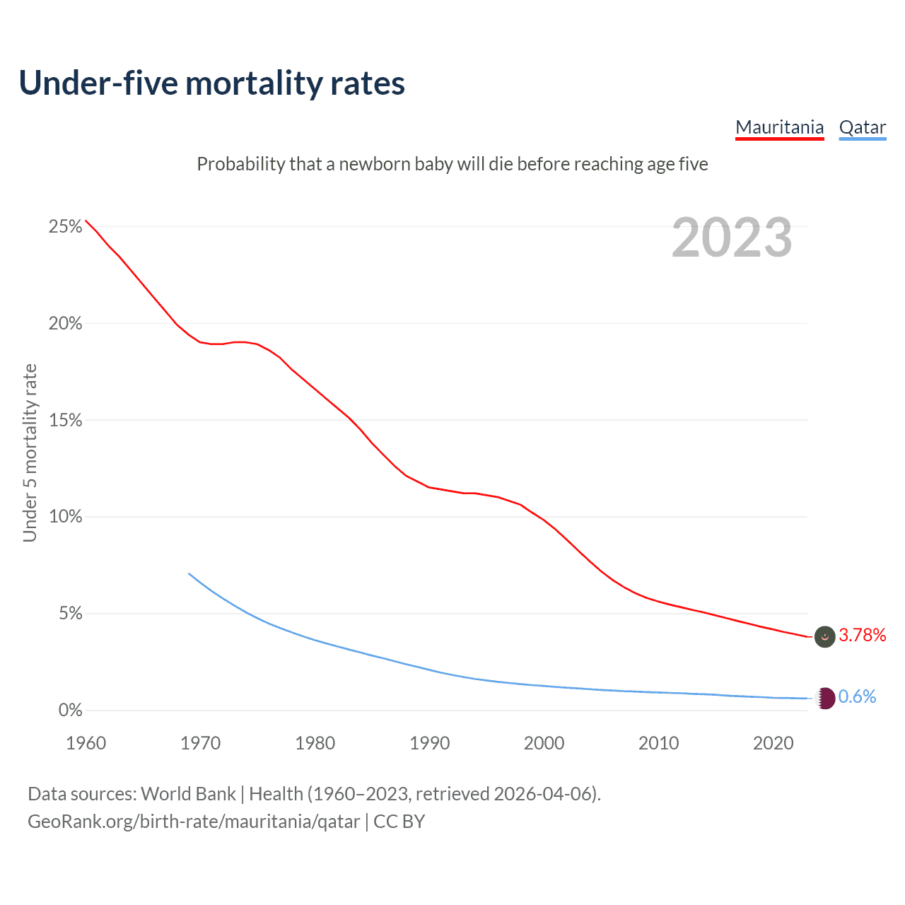 The chance that a newborn baby will die before reaching age five is 3.78% in Mauritania and 0.6% in Qatar. Above is a chart with historical data on under-five mortality rates.