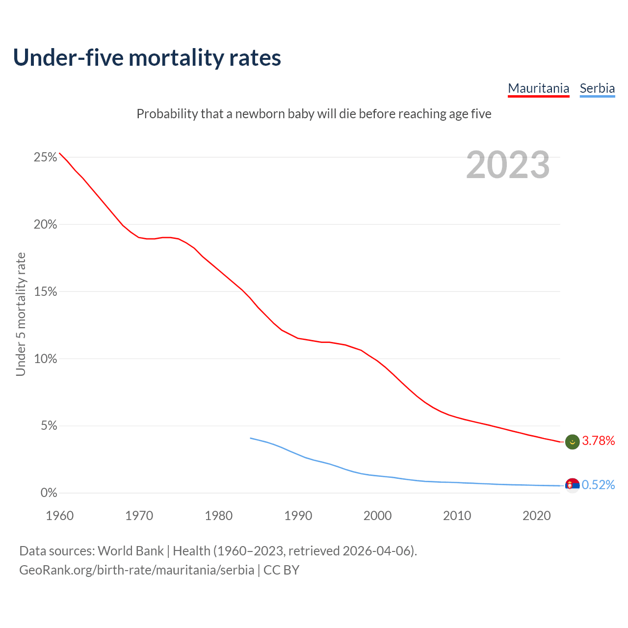 The chance that a newborn baby will die before reaching age five is 3.78% in Mauritania and 0.52% in Serbia. Above is a chart with historical data on under-five mortality rates.