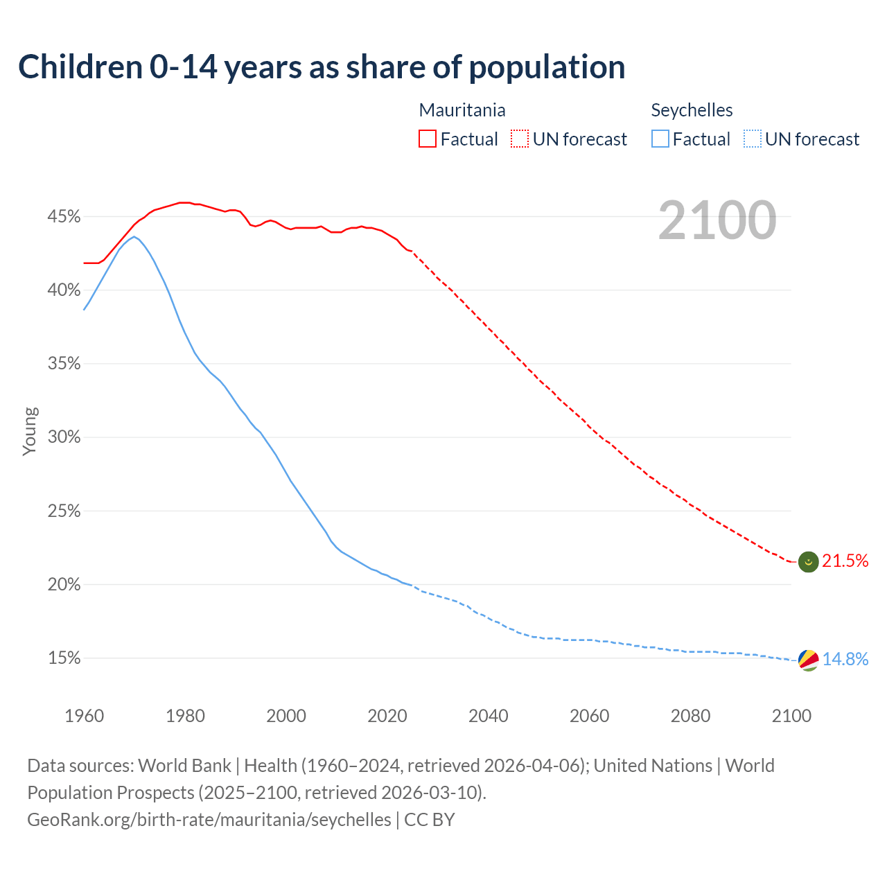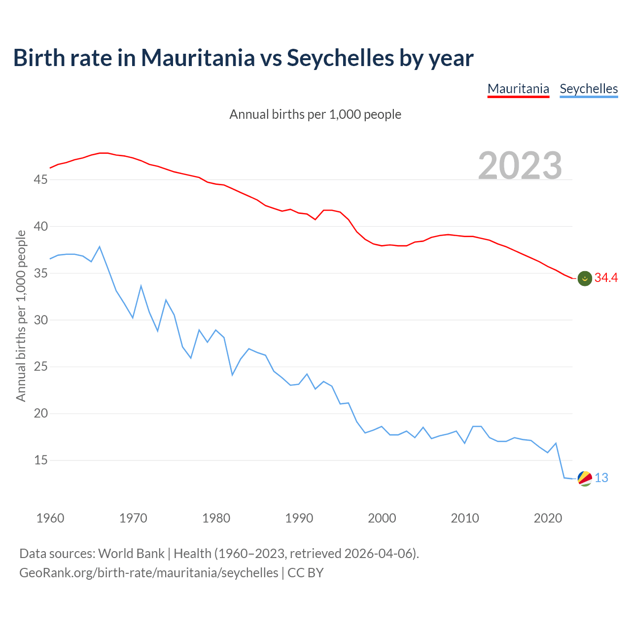 Mauritania has an annual birth rate of 34.4 births per 1,000 people, compared to 13 for the Seychelles. The average number of children a woman is expected to have during her lifetime — the fertility rate, is 4.7 in Mauritania and 2.02 in the Seychelles — 57% difference.