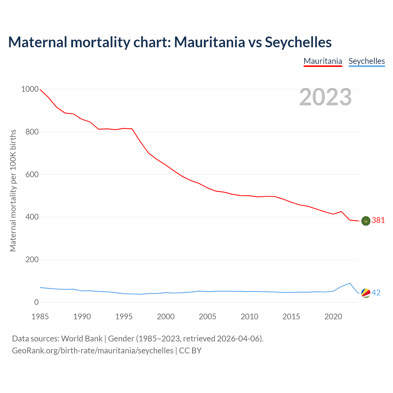 The maternal mortality rate, which is the probability of dying during childbirth or within 42 days of pregnancy termination, is 381 deaths per 100,000 live births in Mauritania, compared to 42 deaths in the Seychelles.