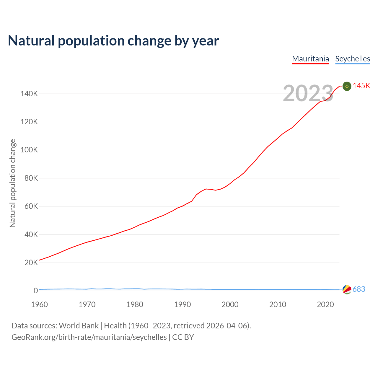 According to the latest available data on birth rates, the fertility rate in Mauritania was 4.7 children per woman in 2023, compared to 2.02 in the Seychelles in 2023. The replacement level is considered to be 2.1 children per woman.
