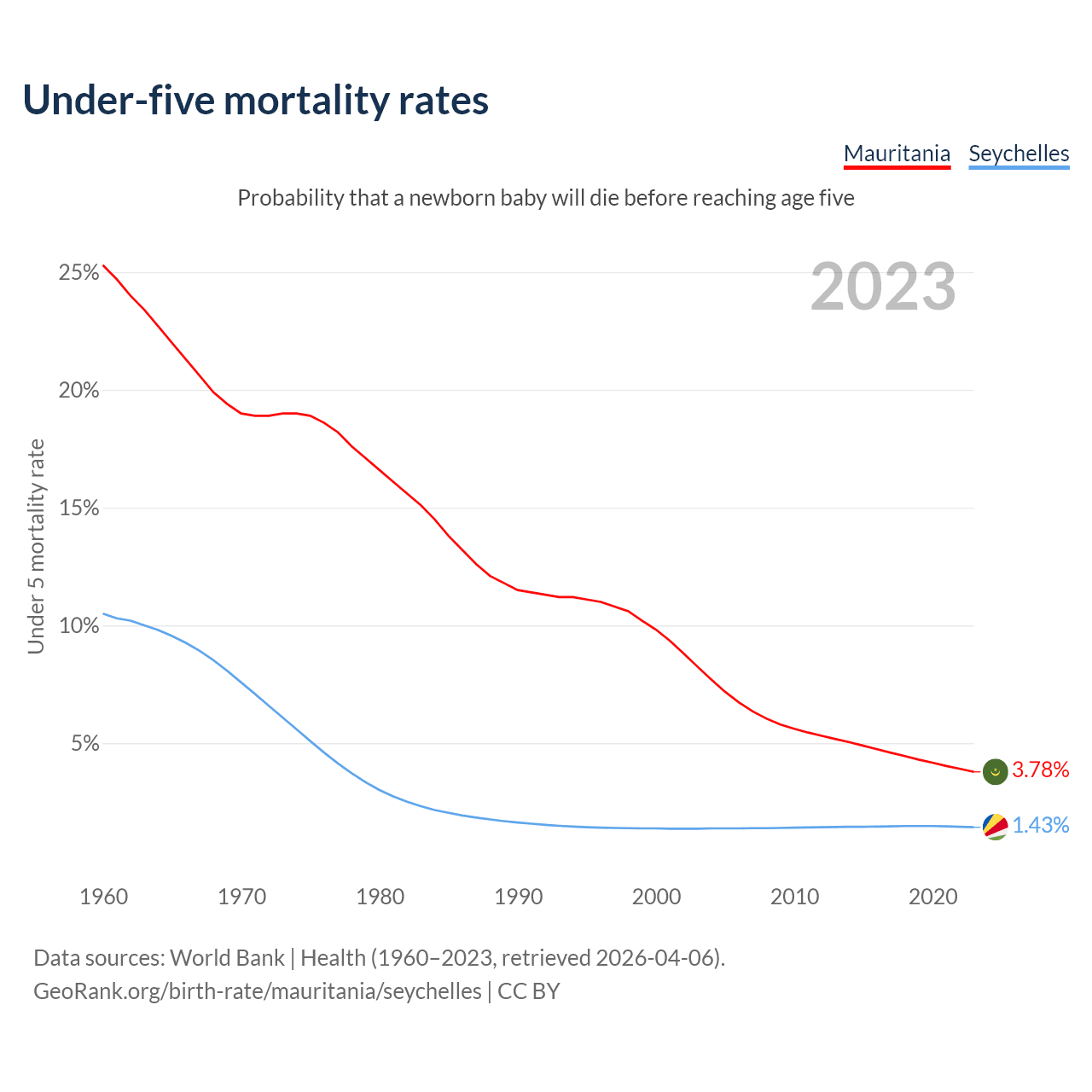 The chance that a newborn baby will die before reaching age five is 3.78% in Mauritania and 1.43% in the Seychelles. Above is a chart with historical data on under-five mortality rates.