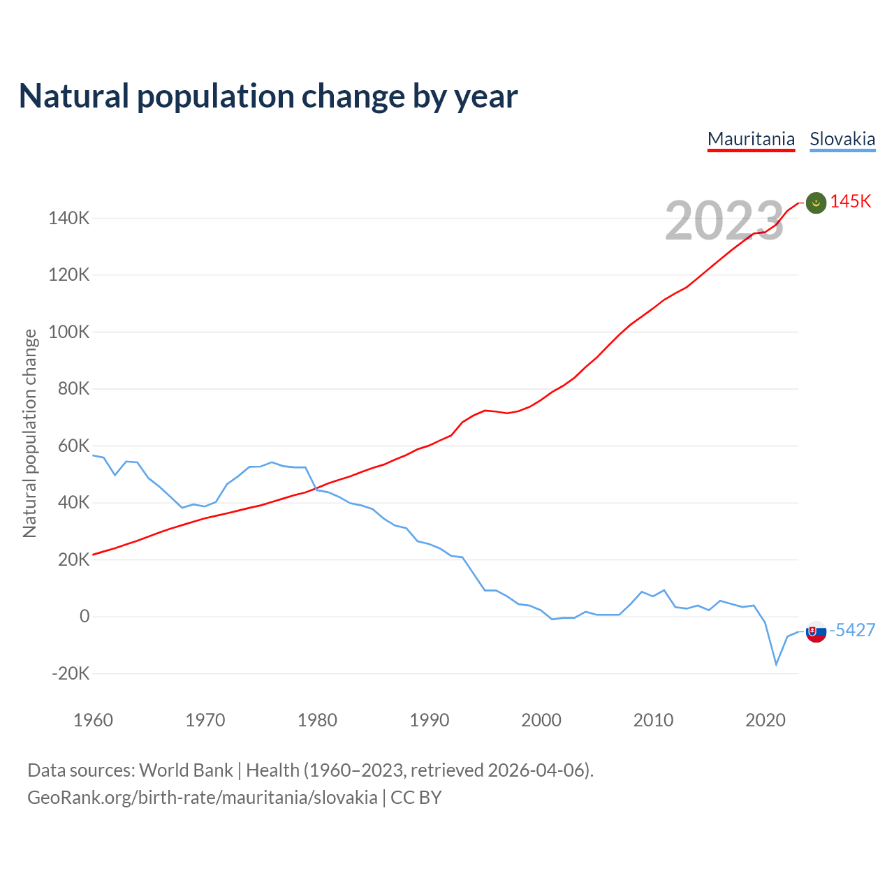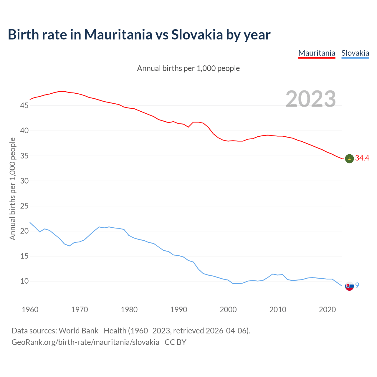 Mauritania has an annual birth rate of 34.4 births per 1,000 people, compared to 9 for Slovakia. The average number of children a woman is expected to have during her lifetime — the fertility rate, is 4.7 in Mauritania and 1.49 in Slovakia — 68.3% difference.
