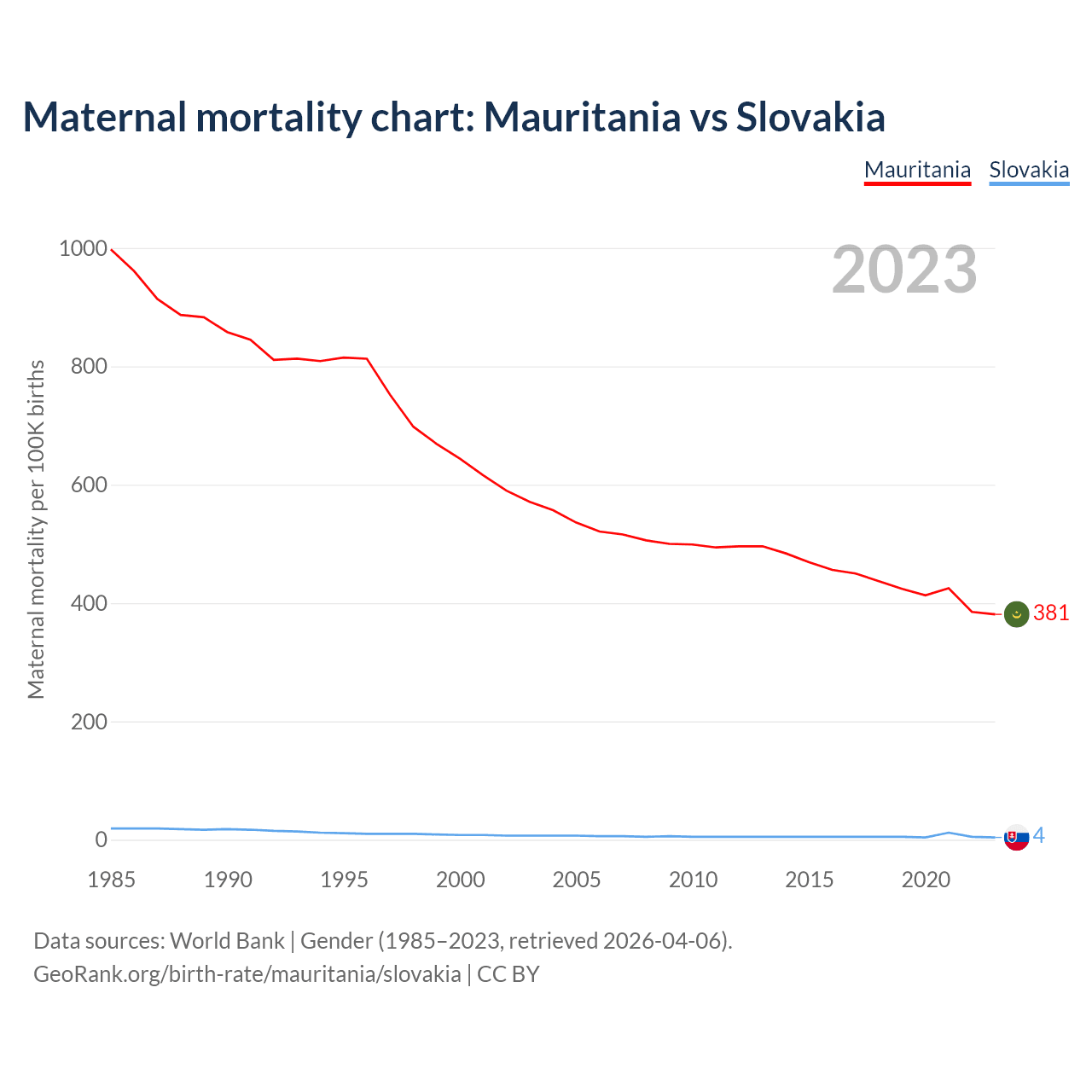 The maternal mortality rate, which is the probability of dying during childbirth or within 42 days of pregnancy termination, is 381 deaths per 100,000 live births in Mauritania, compared to 4 deaths in Slovakia.