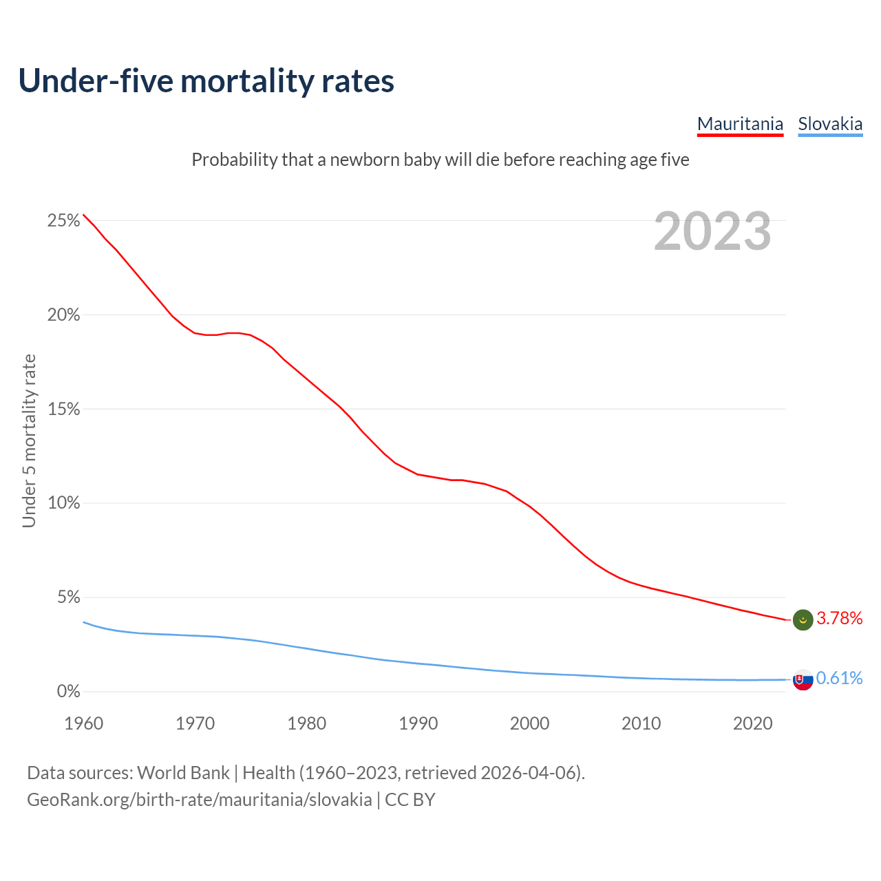 The chance that a newborn baby will die before reaching age five is 3.78% in Mauritania and 0.61% in Slovakia. Above is a chart with historical data on under-five mortality rates.
