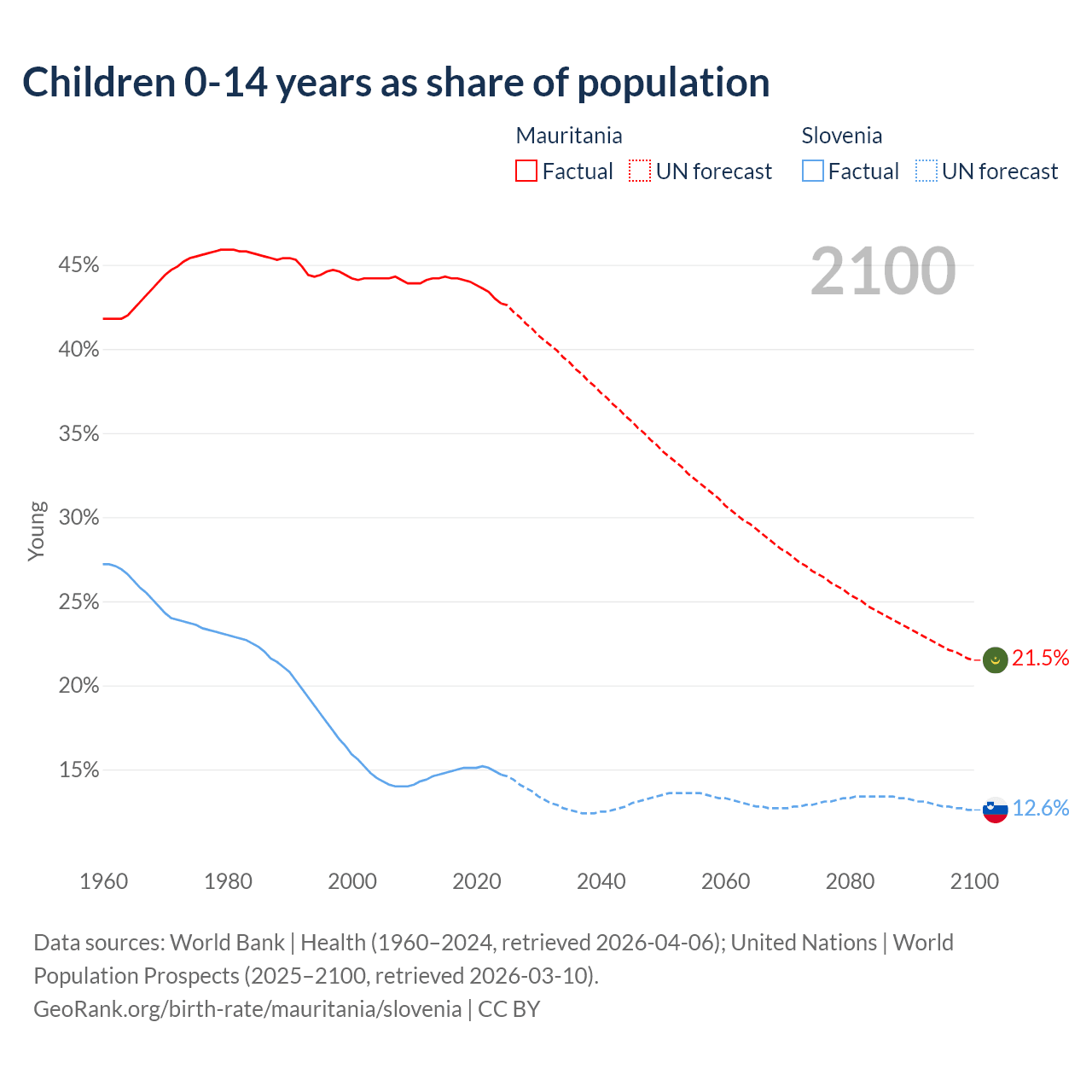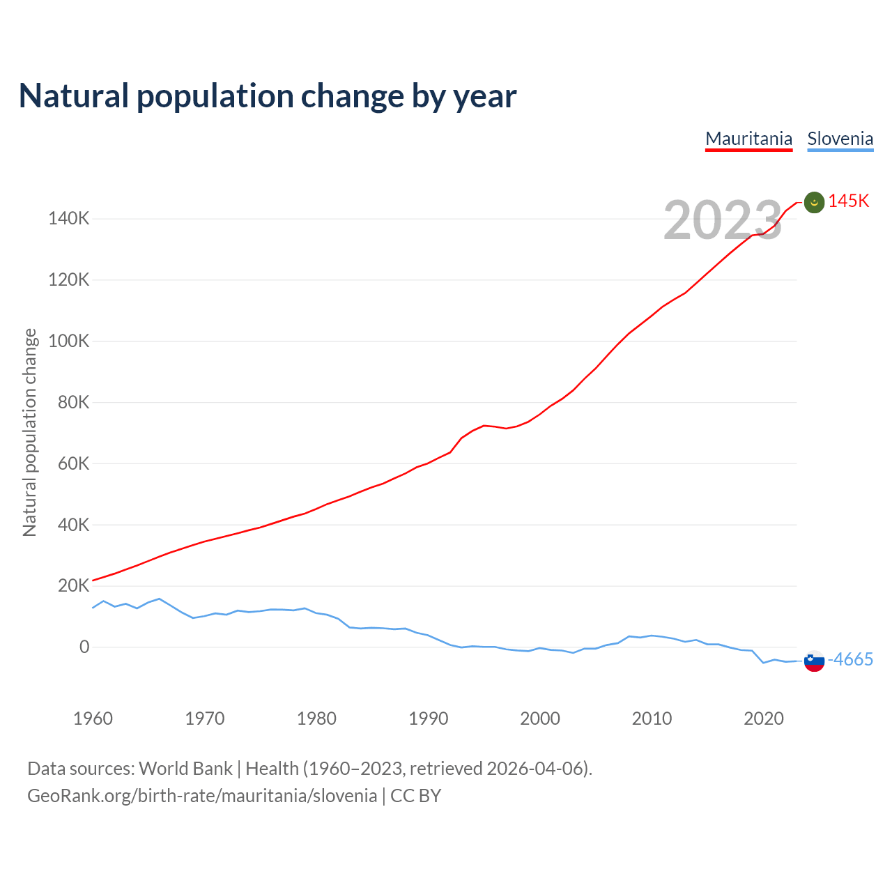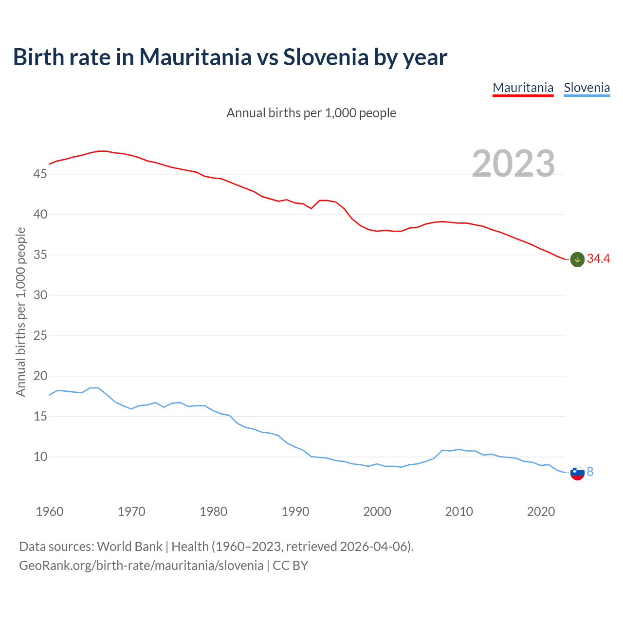 Mauritania has an annual birth rate of 34.4 births per 1,000 people, compared to 8 for Slovenia. The average number of children a woman is expected to have during her lifetime — the fertility rate, is 4.7 in Mauritania and 1.51 in Slovenia — 67.9% difference.