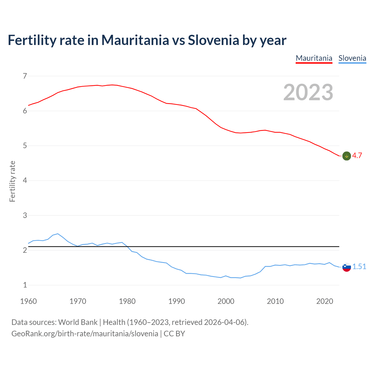 According to the latest available data on birth rates, the fertility rate in Mauritania was 4.7 children per woman in 2023, compared to 1.51 in Slovenia in 2023. The replacement level is considered to be 2.1 children per woman.