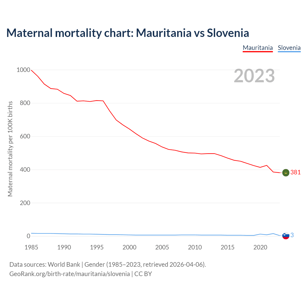 The maternal mortality rate, which is the probability of dying during childbirth or within 42 days of pregnancy termination, is 381 deaths per 100,000 live births in Mauritania, compared to 3 deaths in Slovenia.