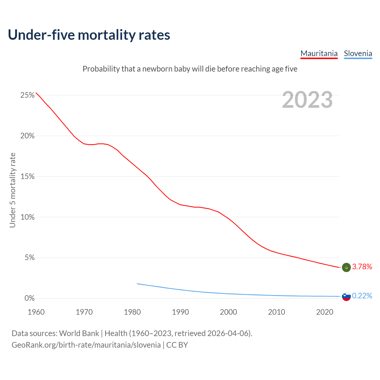 The chance that a newborn baby will die before reaching age five is 3.78% in Mauritania and 0.22% in Slovenia. Above is a chart with historical data on under-five mortality rates.