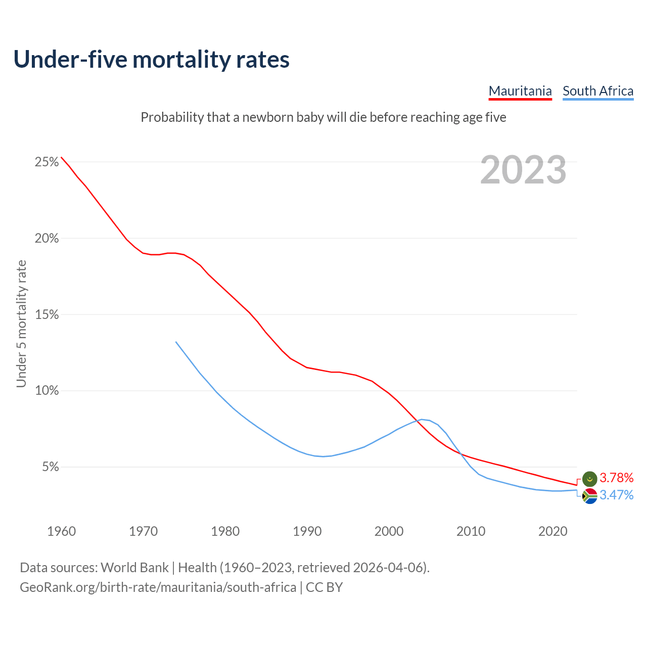 The chance that a newborn baby will die before reaching age five is 3.78% in Mauritania and 3.47% in South Africa. Above is a chart with historical data on under-five mortality rates.