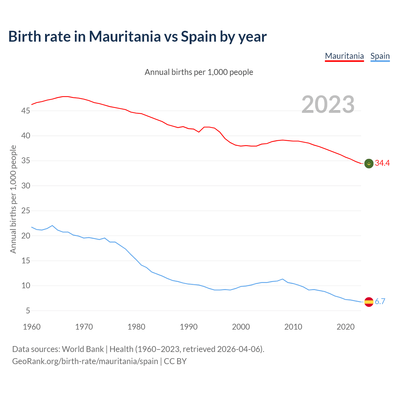 Mauritania has an annual birth rate of 34.4 births per 1,000 people, compared to 6.7 for Spain. The average number of children a woman is expected to have during her lifetime — the fertility rate, is 4.7 in Mauritania and 1.12 in Spain — 76.2% difference.