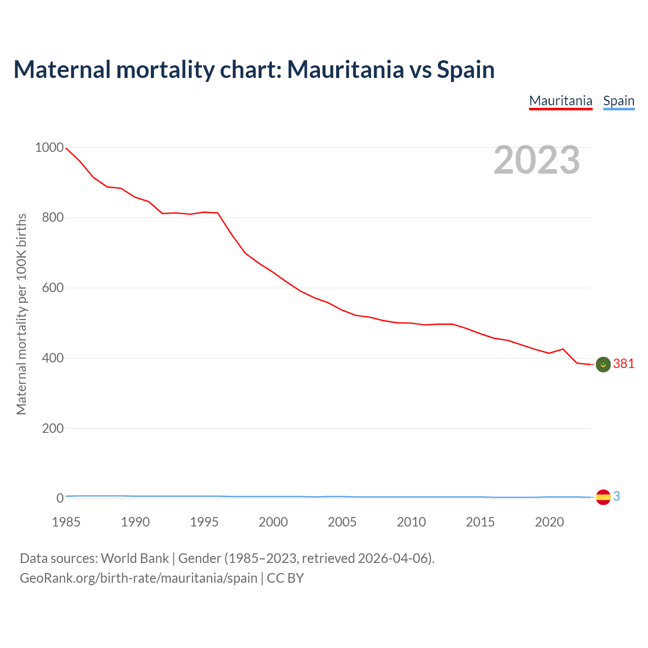 The maternal mortality rate, which is the probability of dying during childbirth or within 42 days of pregnancy termination, is 381 deaths per 100,000 live births in Mauritania, compared to 3 deaths in Spain.