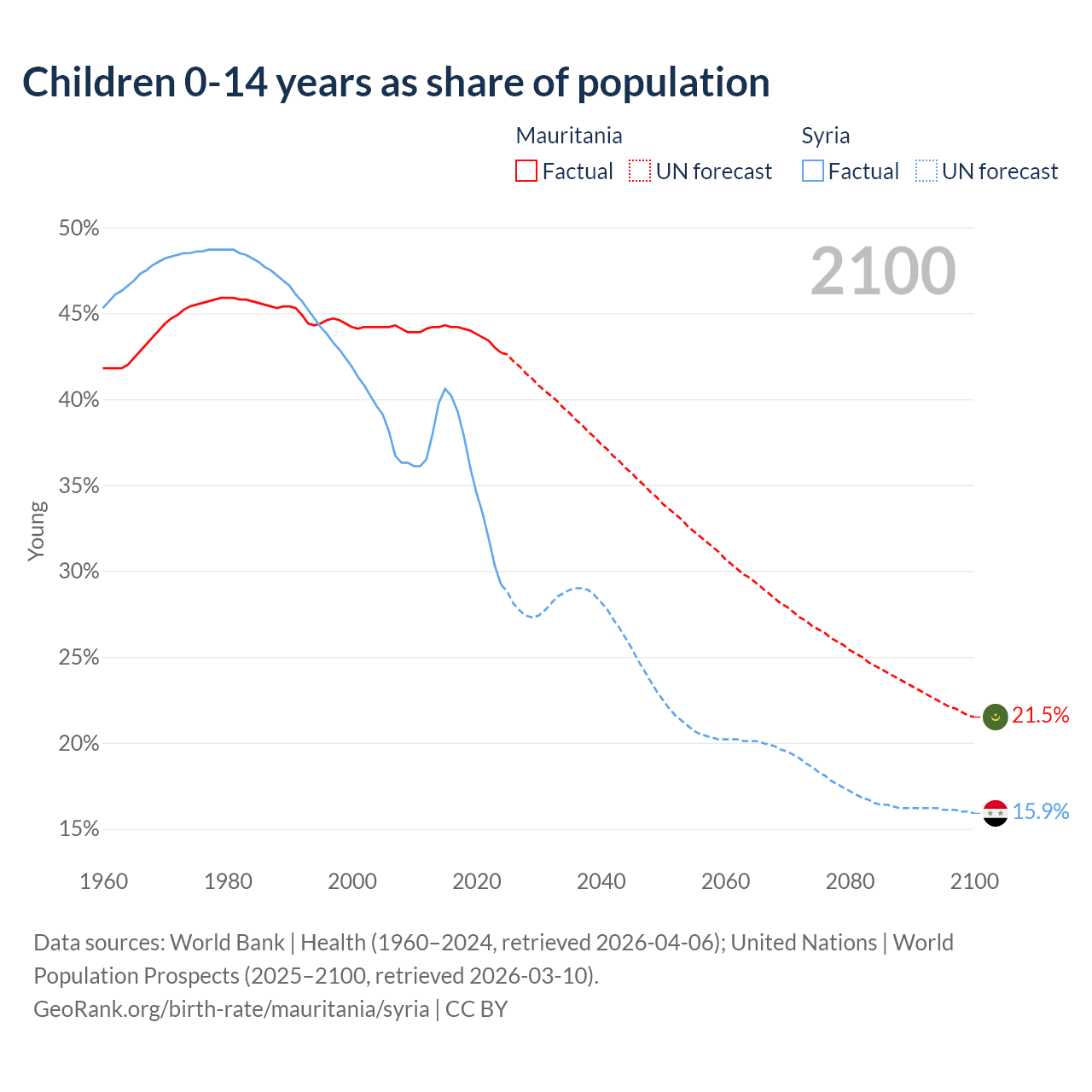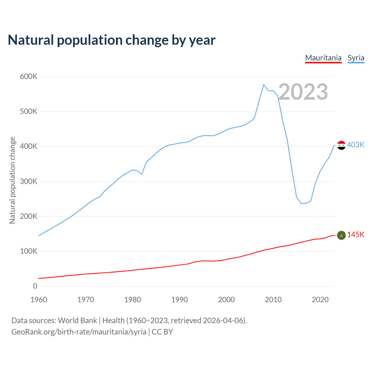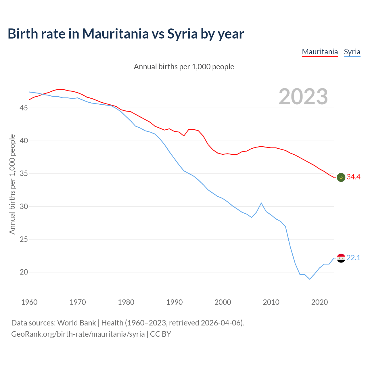 Mauritania has an annual birth rate of 34.4 births per 1,000 people, compared to 22.1 for Syria. The average number of children a woman is expected to have during her lifetime — the fertility rate, is 4.7 in Mauritania and 2.71 in Syria — 42.3% difference.