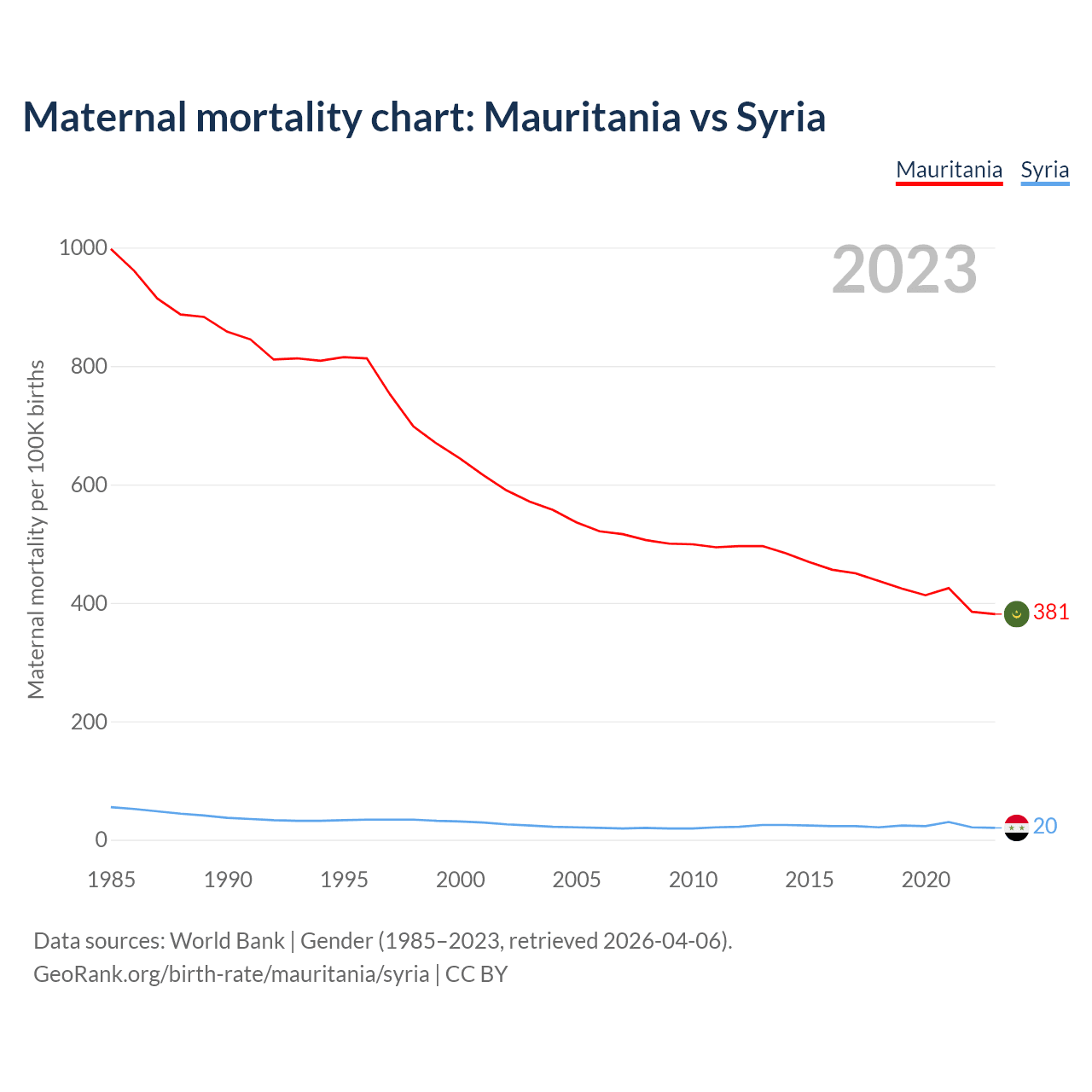 The maternal mortality rate, which is the probability of dying during childbirth or within 42 days of pregnancy termination, is 381 deaths per 100,000 live births in Mauritania, compared to 20 deaths in Syria.