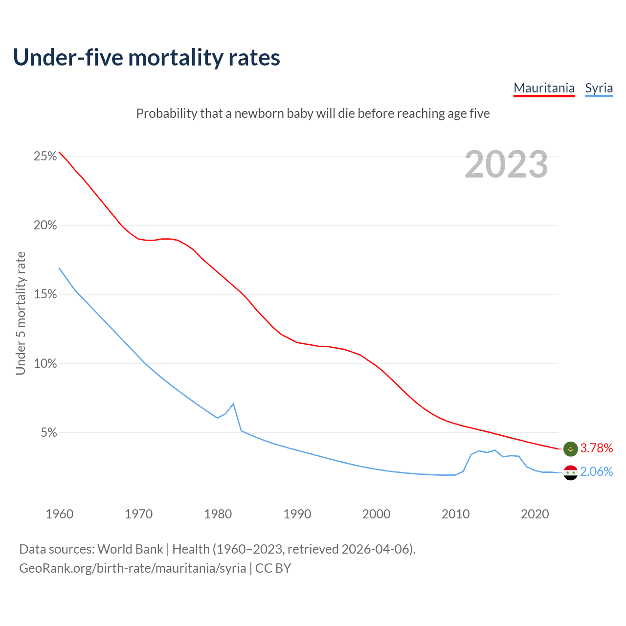 The chance that a newborn baby will die before reaching age five is 3.78% in Mauritania and 2.06% in Syria. Above is a chart with historical data on under-five mortality rates.
