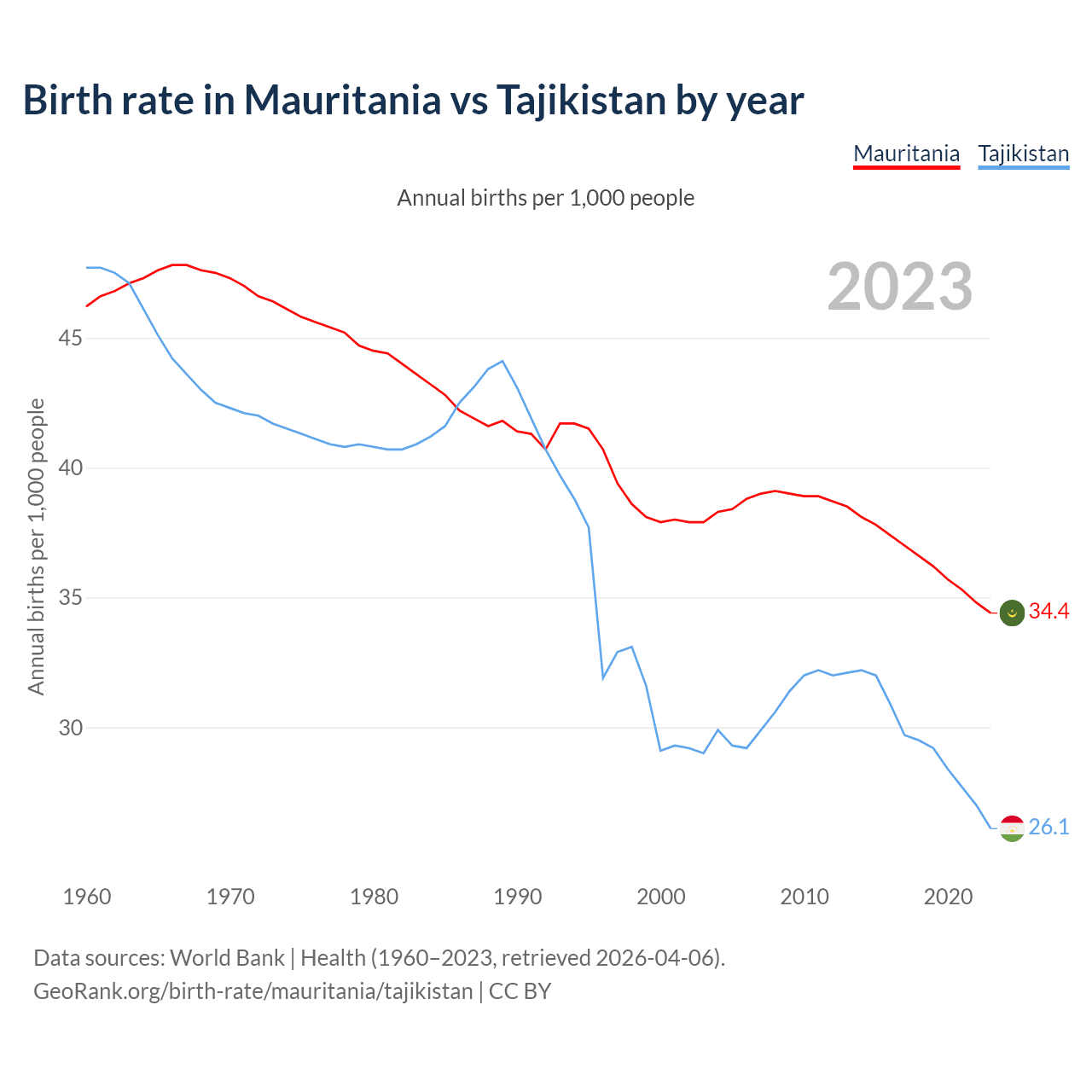 Mauritania has an annual birth rate of 34.4 births per 1,000 people, compared to 26.1 for Tajikistan. The average number of children a woman is expected to have during her lifetime — the fertility rate, is 4.7 in Mauritania and 3.07 in Tajikistan — 34.6% difference.