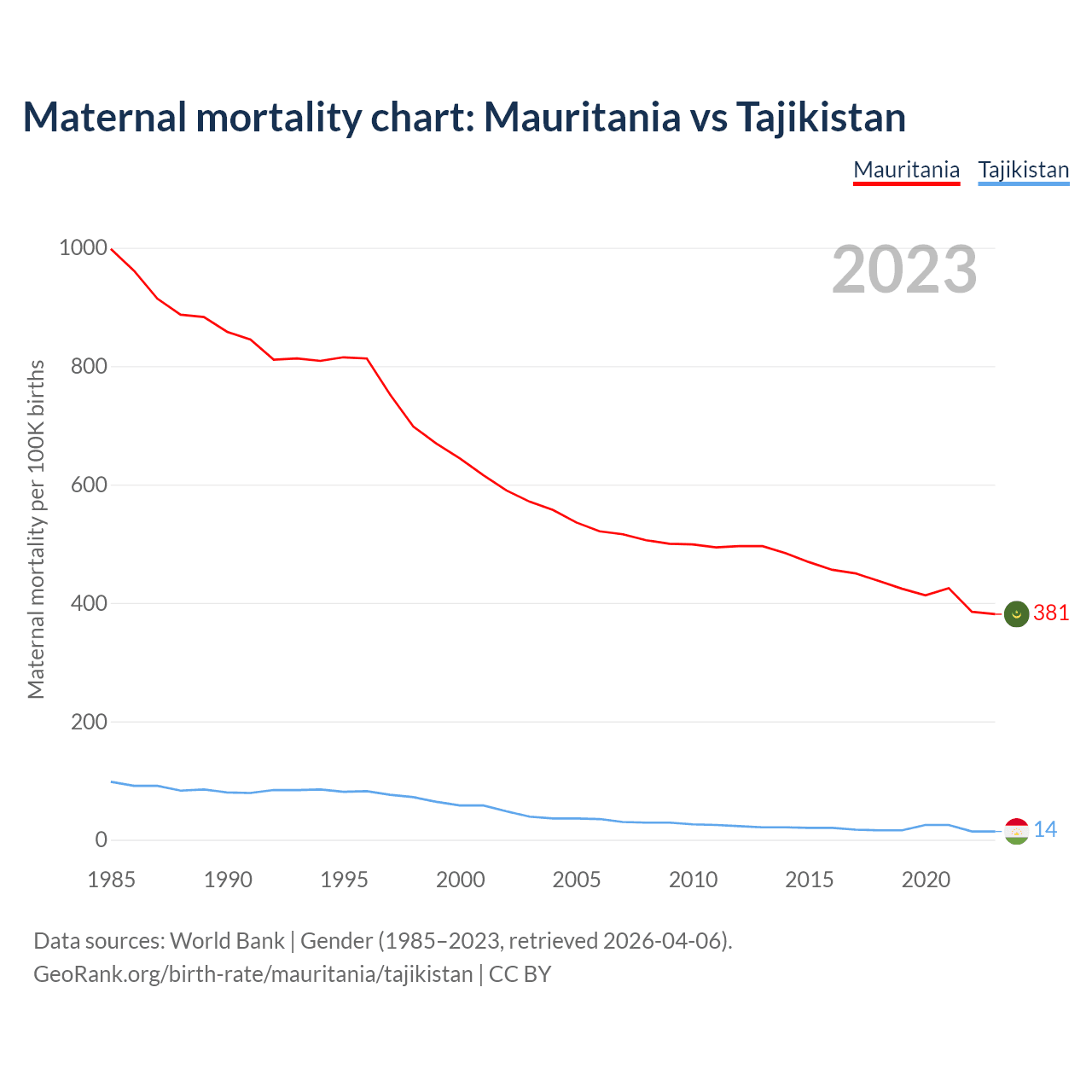 The maternal mortality rate, which is the probability of dying during childbirth or within 42 days of pregnancy termination, is 381 deaths per 100,000 live births in Mauritania, compared to 14 deaths in Tajikistan.