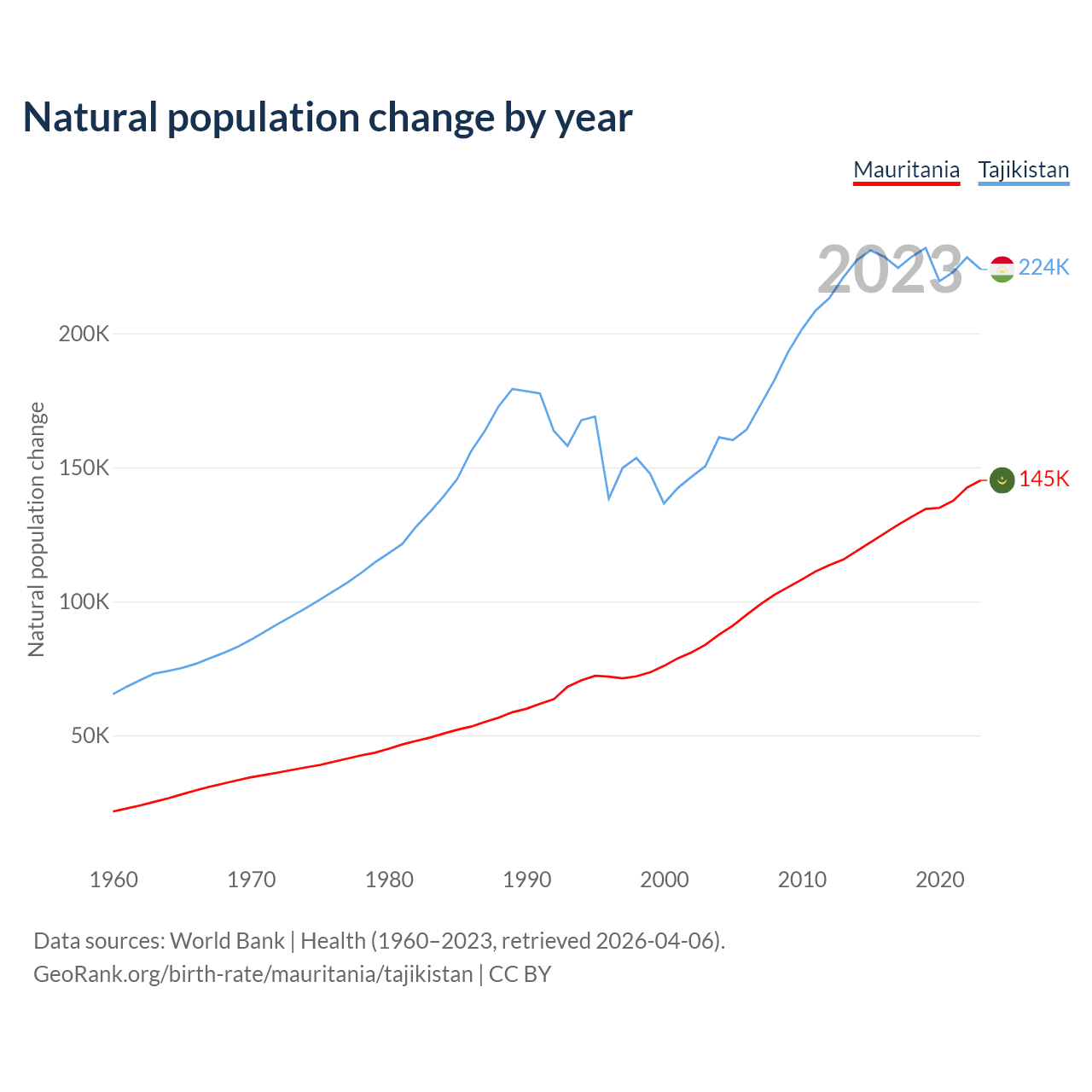 According to the latest available data on birth rates, the fertility rate in Mauritania was 4.7 children per woman in 2023, compared to 3.07 in Tajikistan in 2023. The replacement level is considered to be 2.1 children per woman.