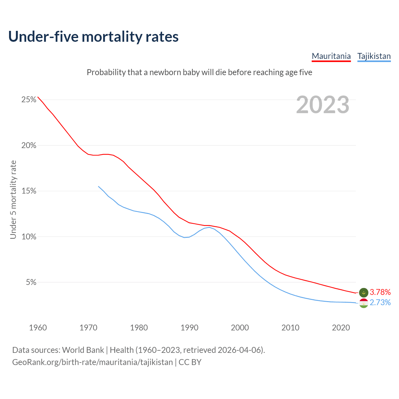 The chance that a newborn baby will die before reaching age five is 3.78% in Mauritania and 2.73% in Tajikistan. Above is a chart with historical data on under-five mortality rates.