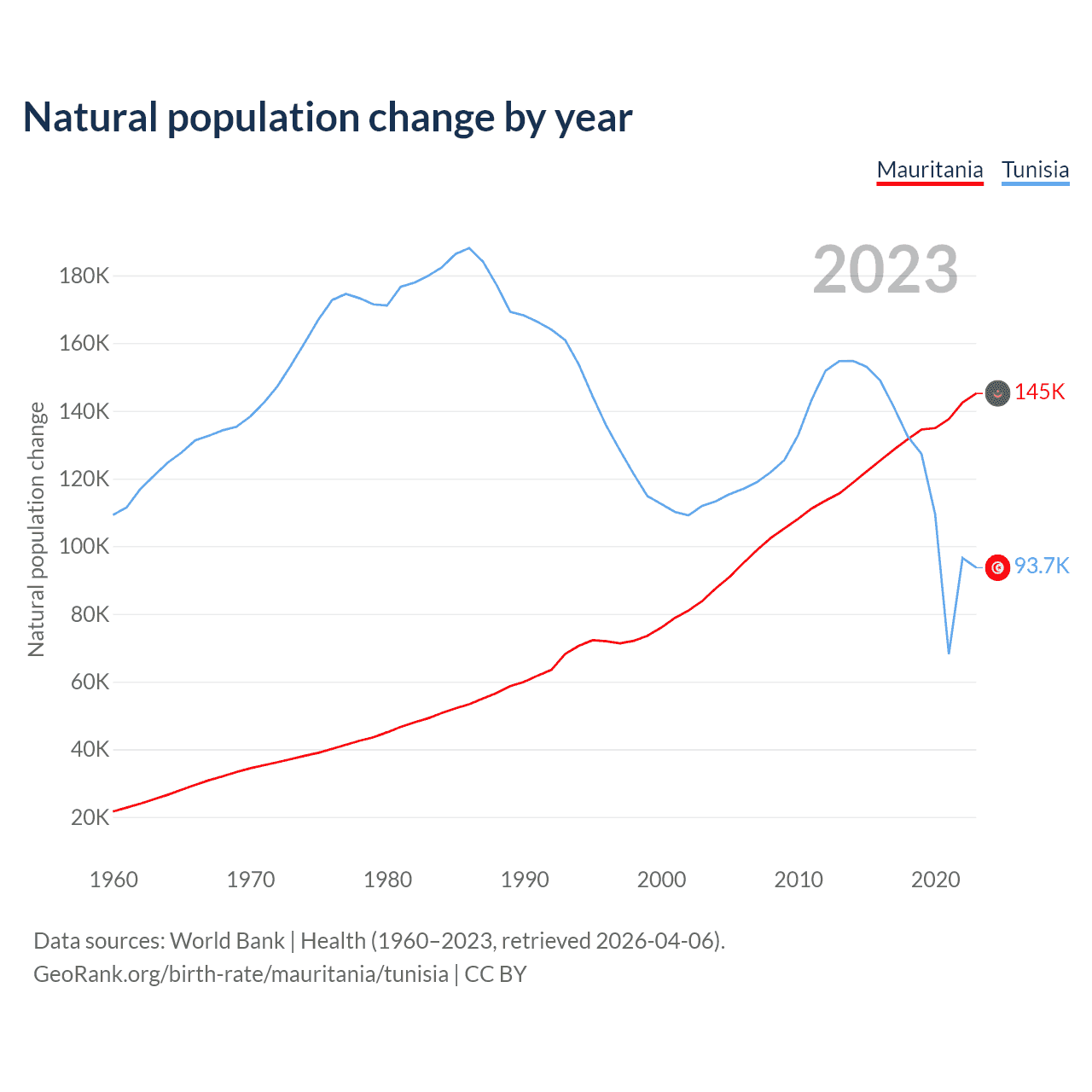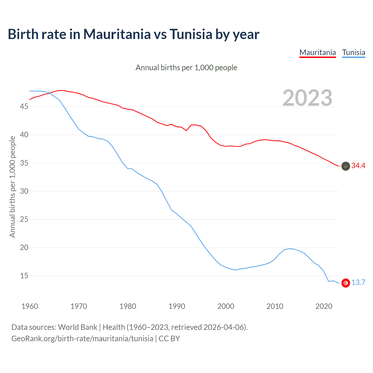 According to the latest available data on birth rates, the fertility rate in Mauritania was 4.7 children per woman in 2023, compared to 1.83 in Tunisia in 2023. The replacement level is considered to be 2.1 children per woman.