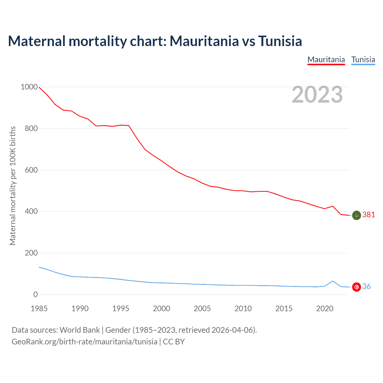 The maternal mortality rate, which is the probability of dying during childbirth or within 42 days of pregnancy termination, is 381 deaths per 100,000 live births in Mauritania, compared to 36 deaths in Tunisia.