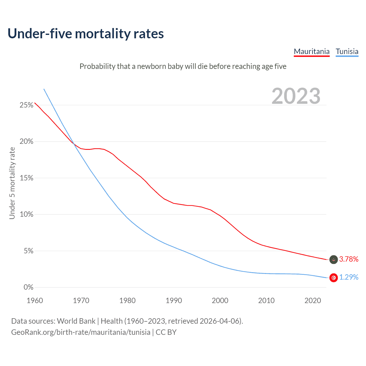 The chance that a newborn baby will die before reaching age five is 3.78% in Mauritania and 1.29% in Tunisia. Above is a chart with historical data on under-five mortality rates.