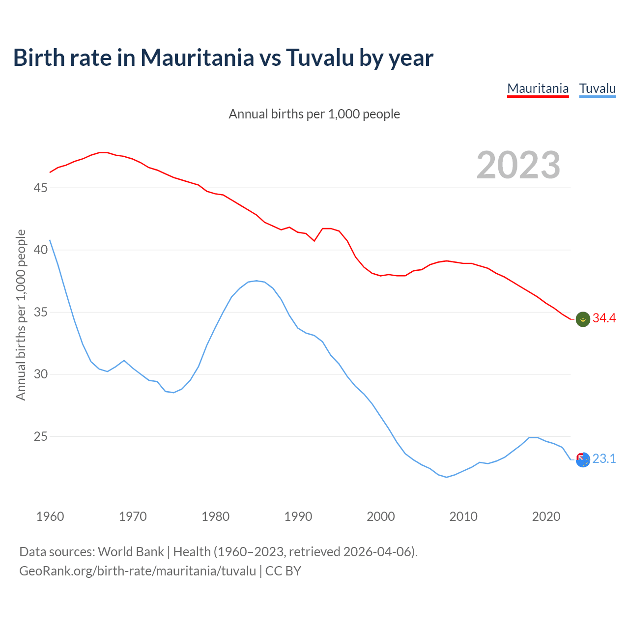 Mauritania has an annual birth rate of 34.4 births per 1,000 people, compared to 23.1 for Tuvalu. The average number of children a woman is expected to have during her lifetime — the fertility rate, is 4.7 in Mauritania and 3.21 in Tuvalu — 31.7% difference.