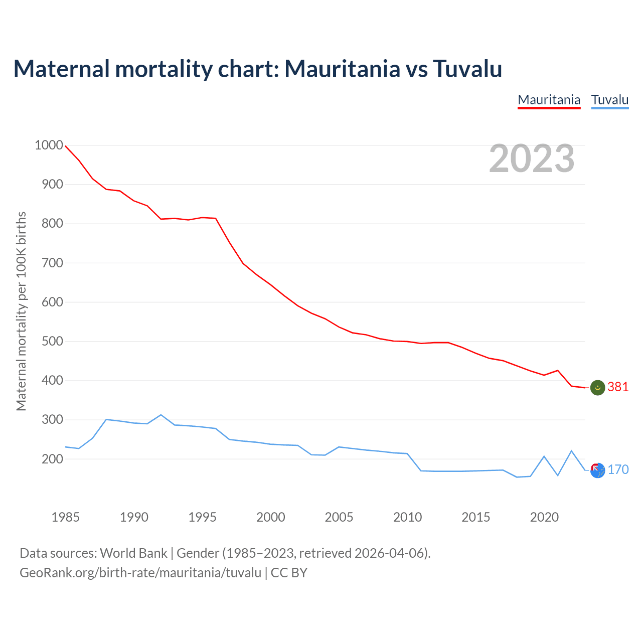The maternal mortality rate, which is the probability of dying during childbirth or within 42 days of pregnancy termination, is 381 deaths per 100,000 live births in Mauritania, compared to 170 deaths in Tuvalu.
