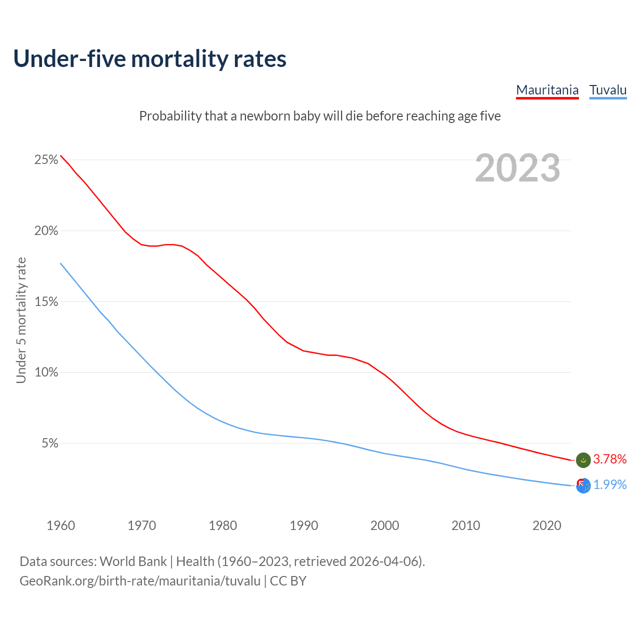 The chance that a newborn baby will die before reaching age five is 3.78% in Mauritania and 1.99% in Tuvalu. Above is a chart with historical data on under-five mortality rates.