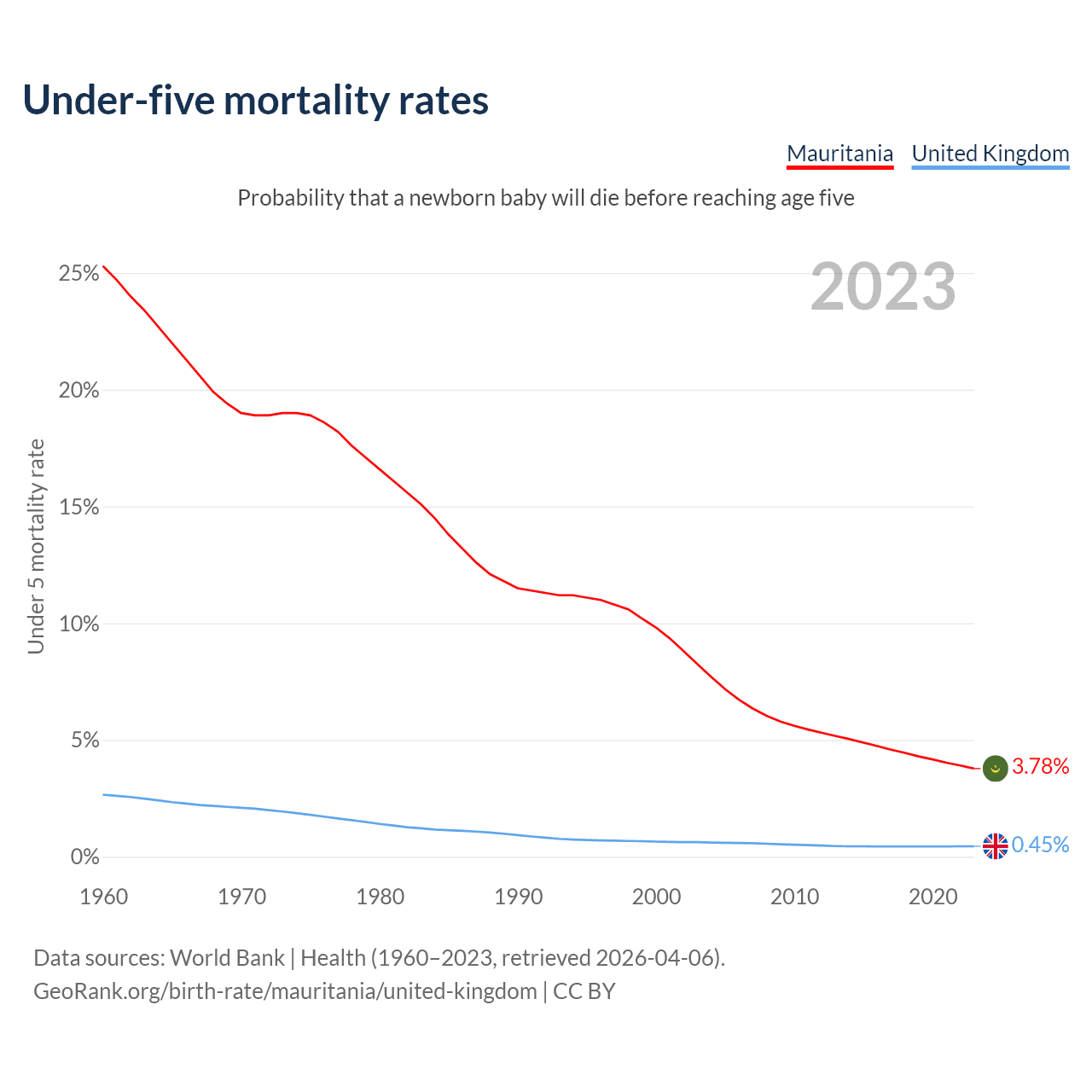 The chance that a newborn baby will die before reaching age five is 3.78% in Mauritania and 0.45% in the United Kingdom. Above is a chart with historical data on under-five mortality rates.