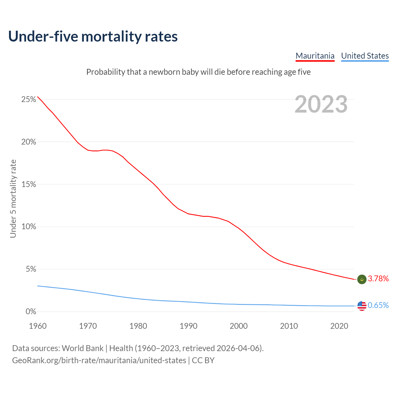 The chance that a newborn baby will die before reaching age five is 3.78% in Mauritania and 0.65% in the United States. Above is a chart with historical data on under-five mortality rates.