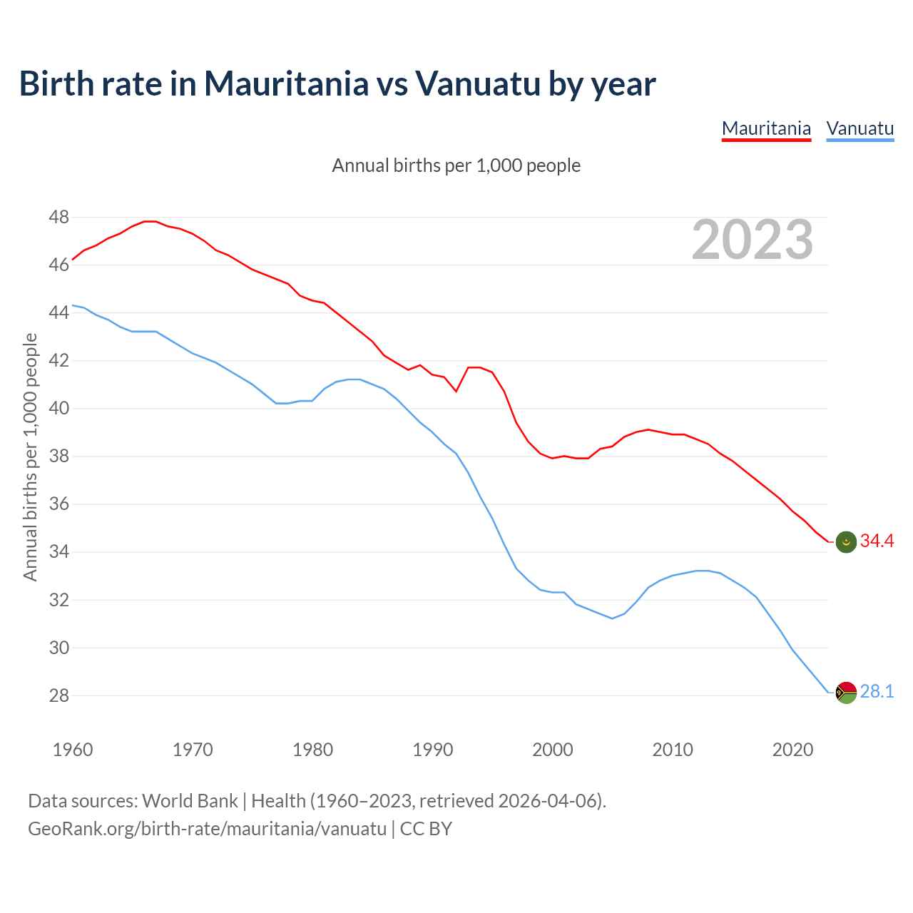 Mauritania has an annual birth rate of 34.4 births per 1,000 people, compared to 28.1 for Vanuatu. The average number of children a woman is expected to have during her lifetime — the fertility rate, is 4.7 in Mauritania and 3.6 in Vanuatu — 23.4% difference.