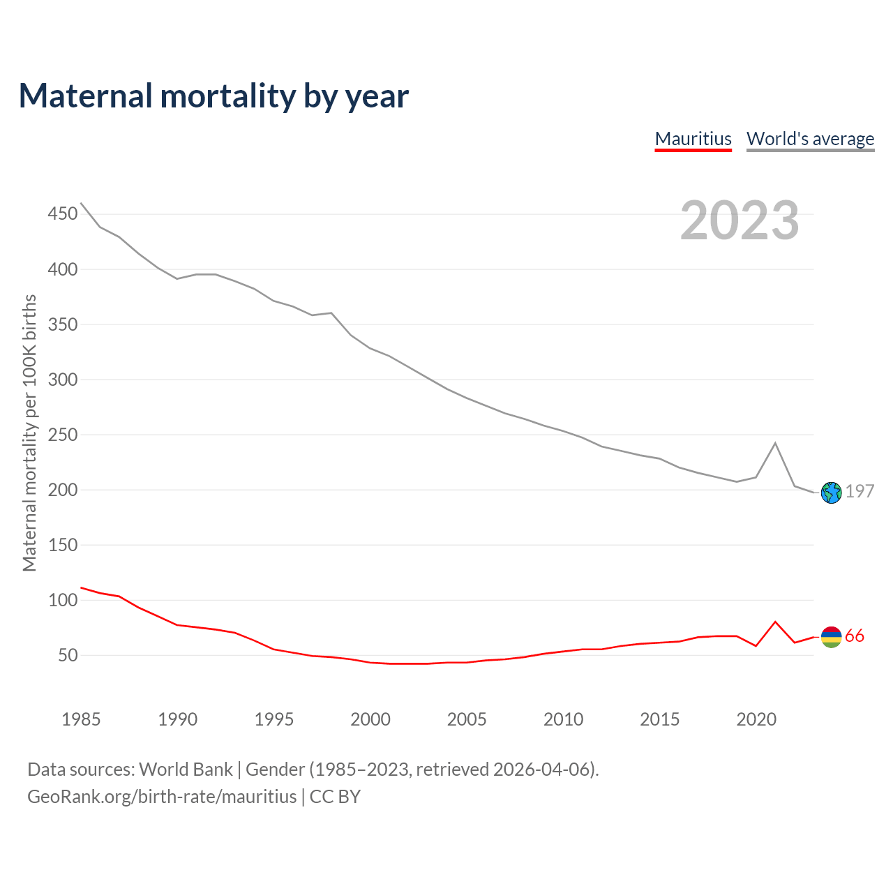 The maternal mortality rate in Mauritius was 66 deaths per 100,000 live births in 2023 — a 0.07% chance of dying during childbirth or within 42 days of pregnancy termination. This is a 53.5% increase compared to the year 2000.