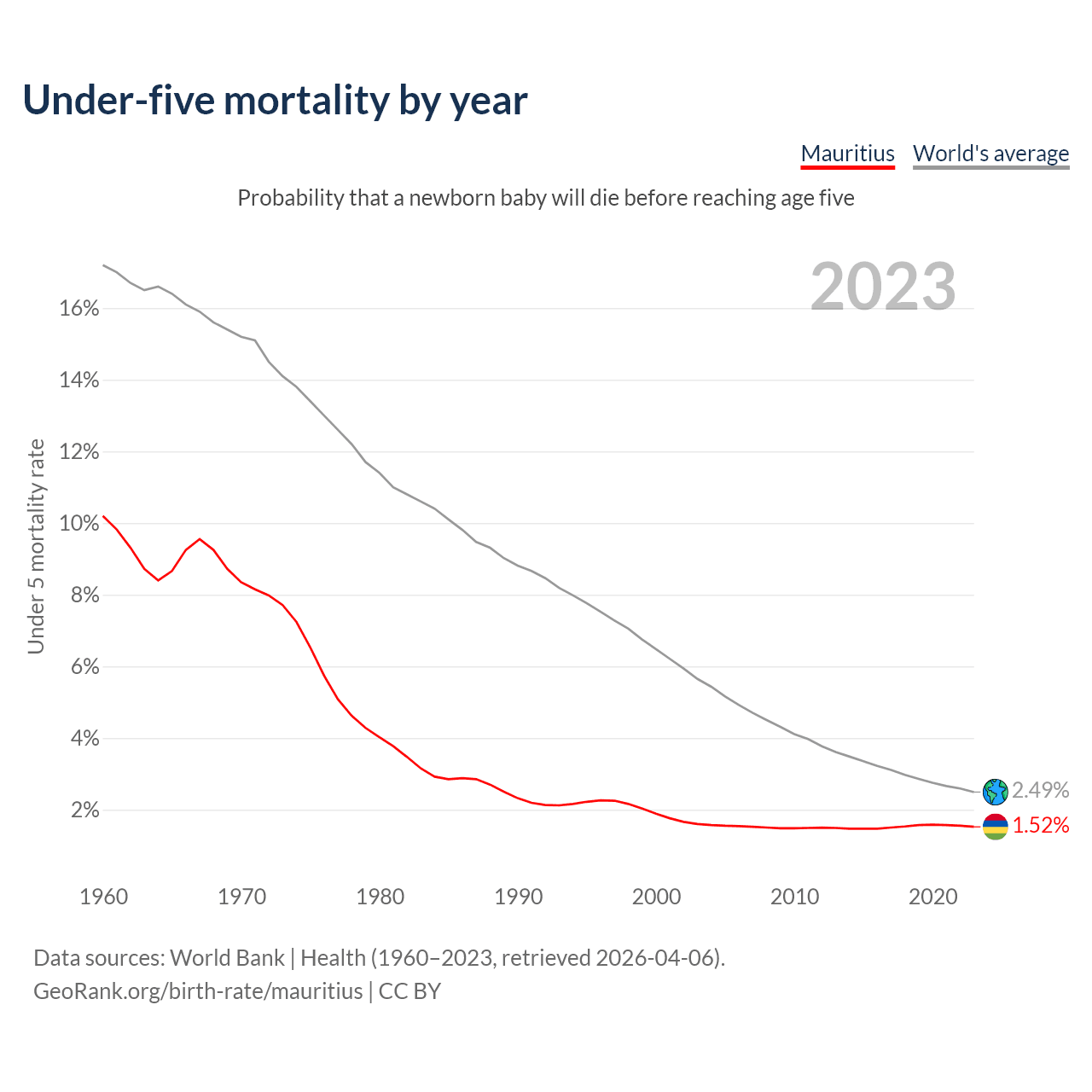 The under-5 mortality rate in Mauritius was 15.2 deaths per 1,000 live births in 2023 — a 1.52% chance that a newborn baby will die before reaching age five. This is down from 18.9 deaths per 1,000 live births in 2000.