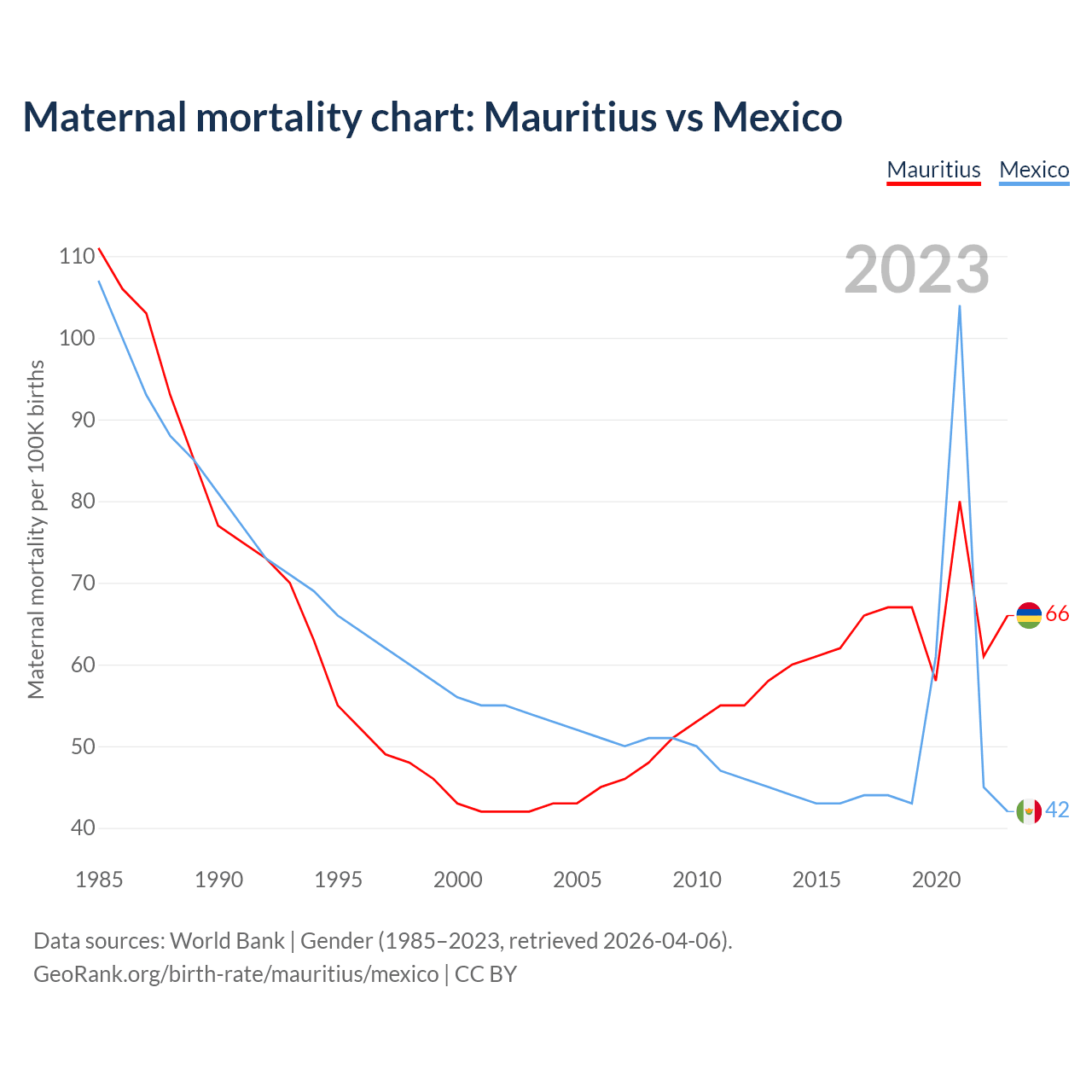 The maternal mortality rate, which is the probability of dying during childbirth or within 42 days of pregnancy termination, is 66 deaths per 100,000 live births in Mauritius, compared to 42 deaths in Mexico.