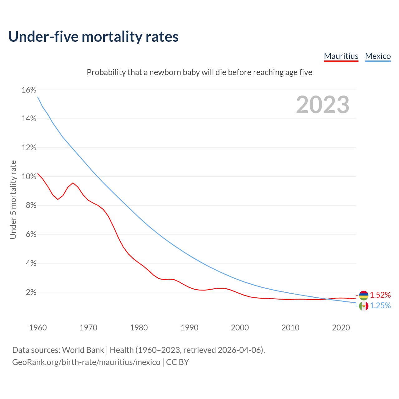 The chance that a newborn baby will die before reaching age five is 1.52% in Mauritius and 1.25% in Mexico. Above is a chart with historical data on under-five mortality rates.