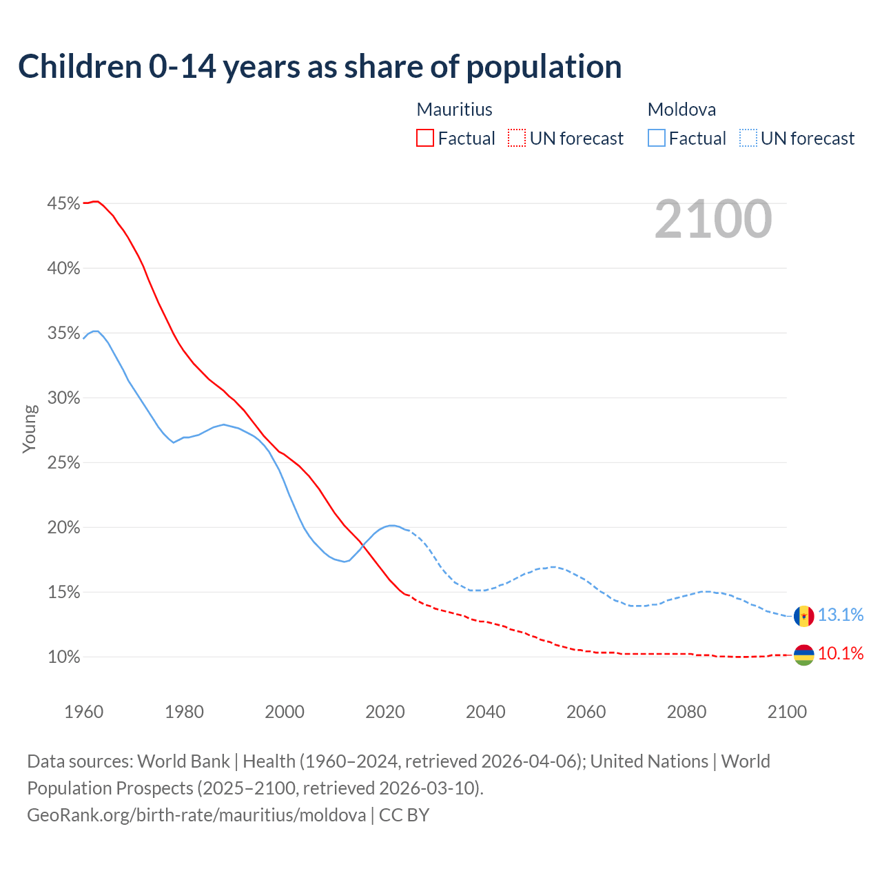 According to the latest available data on birth rates, the fertility rate in Mauritius was 1.39 children per woman in 2023, compared to 1.73 in Moldova in 2023. The replacement level is considered to be 2.1 children per woman.