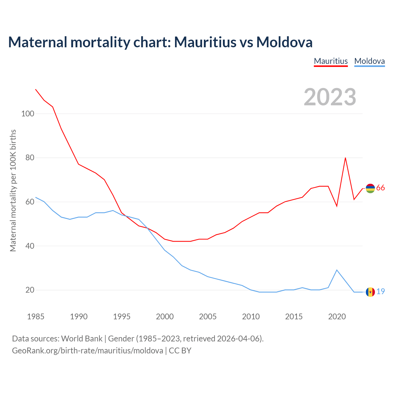 The maternal mortality rate, which is the probability of dying during childbirth or within 42 days of pregnancy termination, is 66 deaths per 100,000 live births in Mauritius, compared to 19 deaths in Moldova.