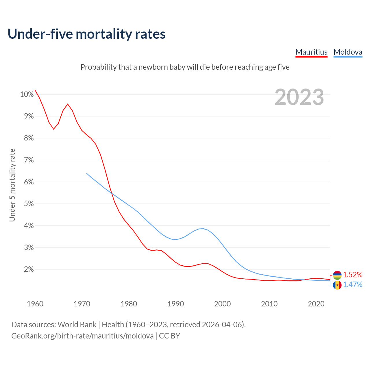 The chance that a newborn baby will die before reaching age five is 1.52% in Mauritius and 1.47% in Moldova. Above is a chart with historical data on under-five mortality rates.
