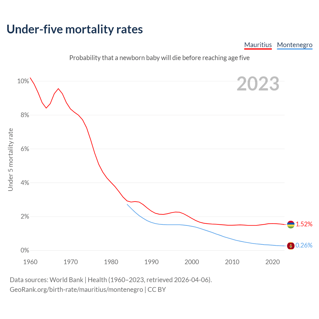 The chance that a newborn baby will die before reaching age five is 1.52% in Mauritius and 0.26% in Montenegro. Above is a chart with historical data on under-five mortality rates.