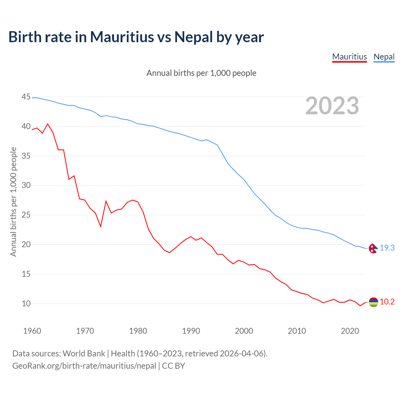 Mauritius has an annual birth rate of 10.2 births per 1,000 people, compared to 19.3 for Nepal. The average number of children a woman is expected to have during her lifetime — the fertility rate, is 1.39 in Mauritius and 1.98 in Nepal — 42.7% difference.