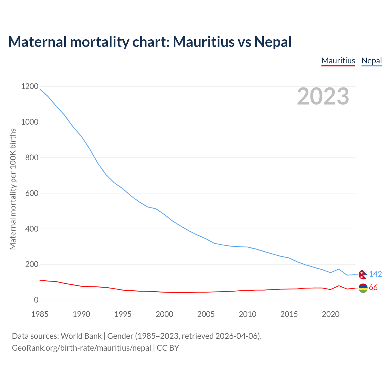 The maternal mortality rate, which is the probability of dying during childbirth or within 42 days of pregnancy termination, is 66 deaths per 100,000 live births in Mauritius, compared to 142 deaths in Nepal.