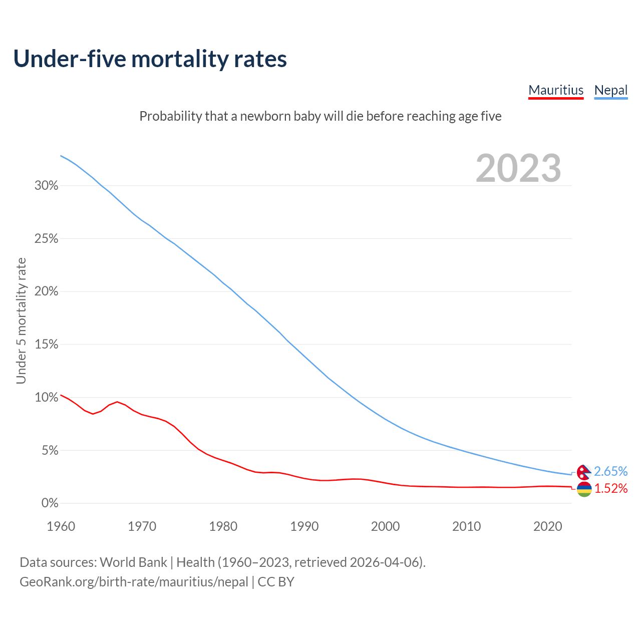 The chance that a newborn baby will die before reaching age five is 1.52% in Mauritius and 2.65% in Nepal. Above is a chart with historical data on under-five mortality rates.