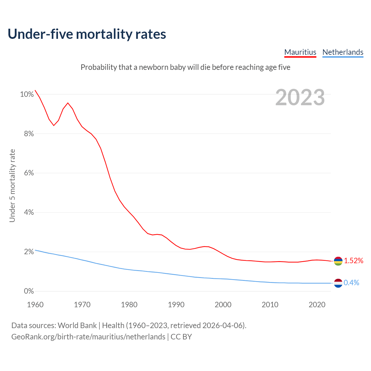 The chance that a newborn baby will die before reaching age five is 1.52% in Mauritius and 0.4% in the Netherlands. Above is a chart with historical data on under-five mortality rates.